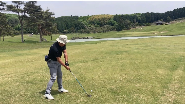 今回、傾斜地で一番意識したポイントは、ボールポジションでした。