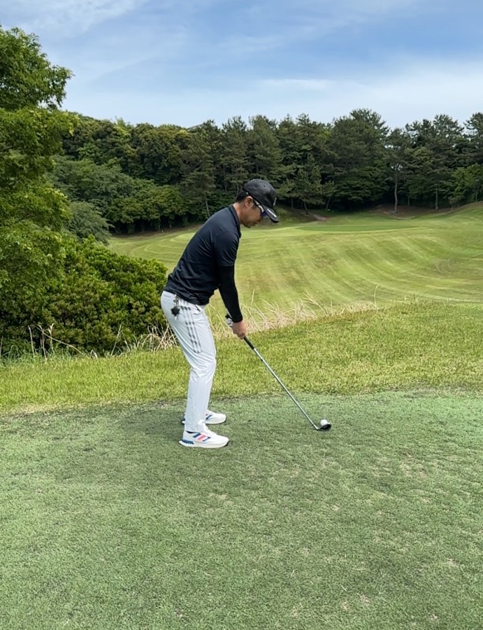 コースレッスのテーマはダウンスイングでの左荷重です。