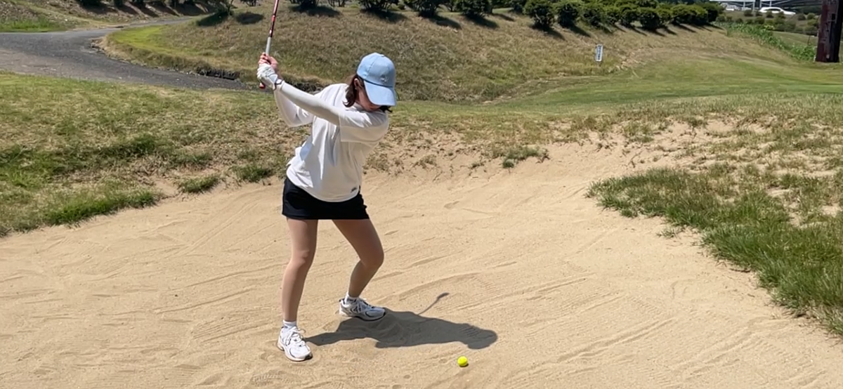 バンカーではヘッドを落とす場所が一定になるように練習しました。理想的なバンカーショットではヘッドをボールの約3センチほど手前に入るといいとされています。