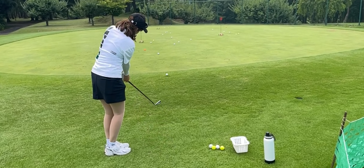 この日は7番アイアンを使い、どんな場所からも転がして寄せる一番安全なアプローチを練習していただきました。ピンまでの傾斜を読んで正確に転がしていきます。