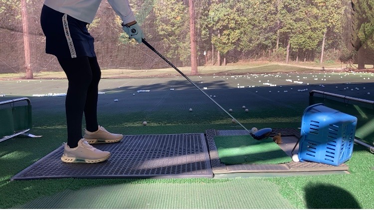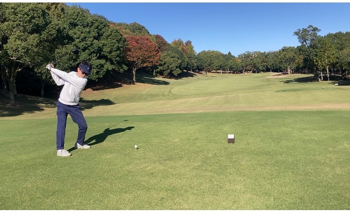 ①ティーショットではティーアップしたら後方へ下がり後方で素振りを行いました。