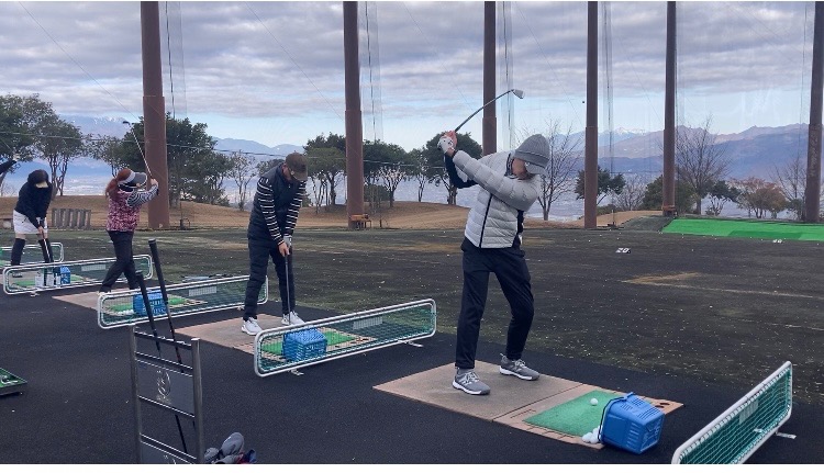 たくさんウェアを着込んだ中でどれだけスイングができるのかもチェックしながら練習しました。