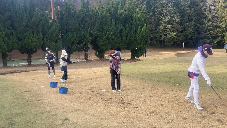 すっかり茶色になってしまった芝生の感触を確かめるようにアプローチ練習を行いました!