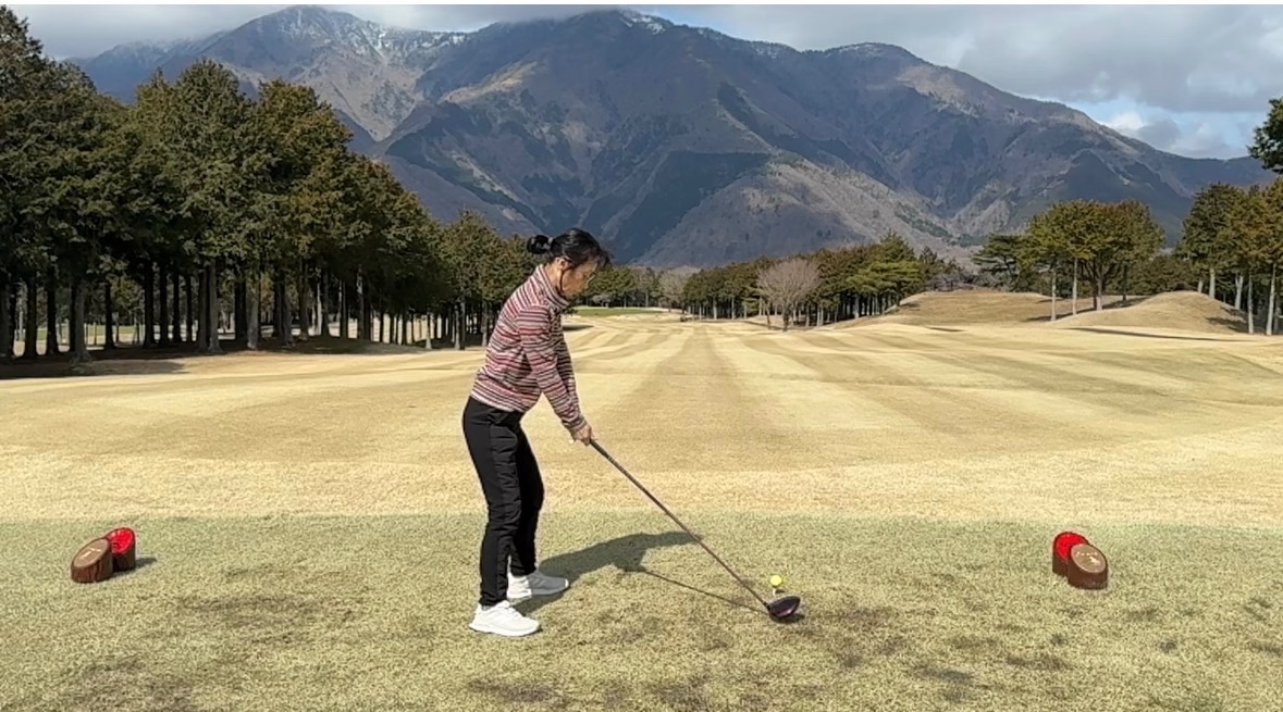 ①のアドレス時のポールとの距離ですが、S様はラウンド時の特に1Wでボールとの距離がほんの少し近くなりクラブヘッドのネックに当たることが多いため素振りでの通り道をしっかり確認してから打球していただきました。