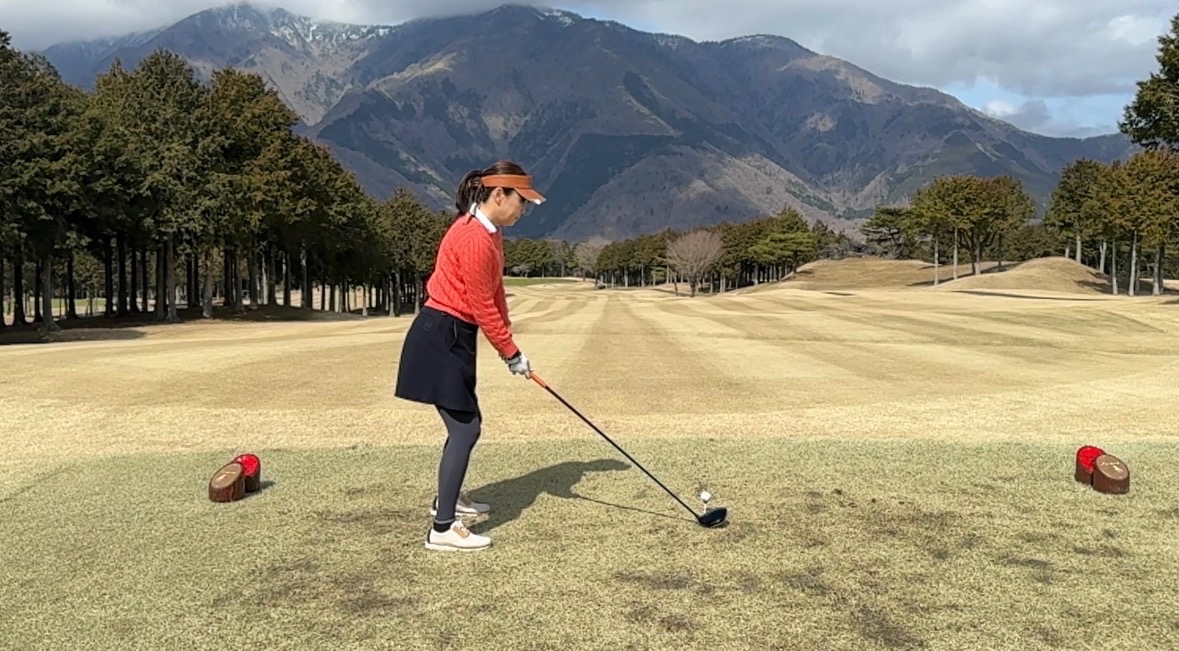 ①アドレス時の向きは、アドレスに入る前に必ず後方から目標を確認、スパットを決めてそれを基準にアドレス、を履践していただきました。